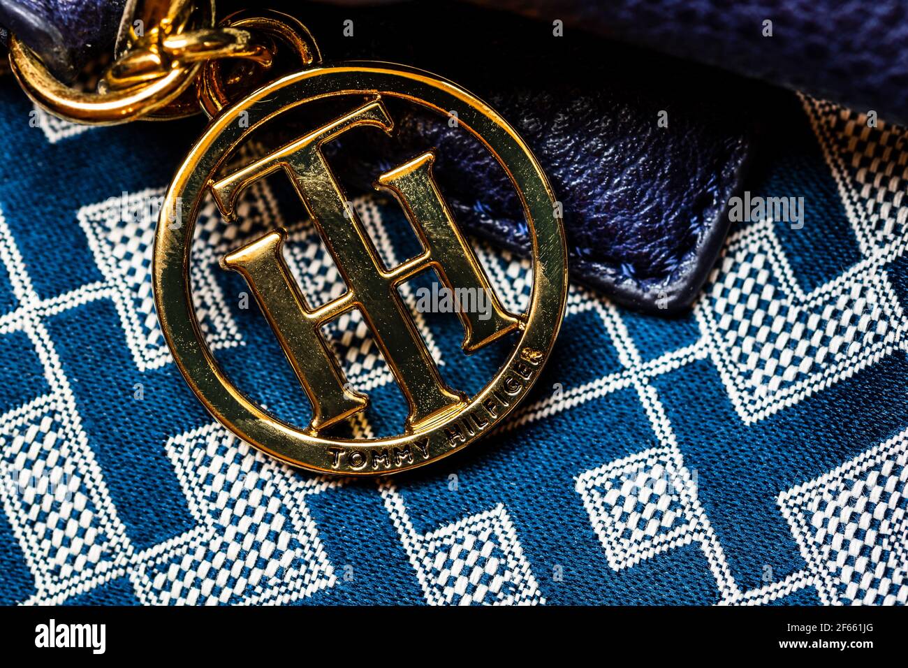 Closeup Of Tommy Hilfiger Label On Green Background Stock Photo Alamy