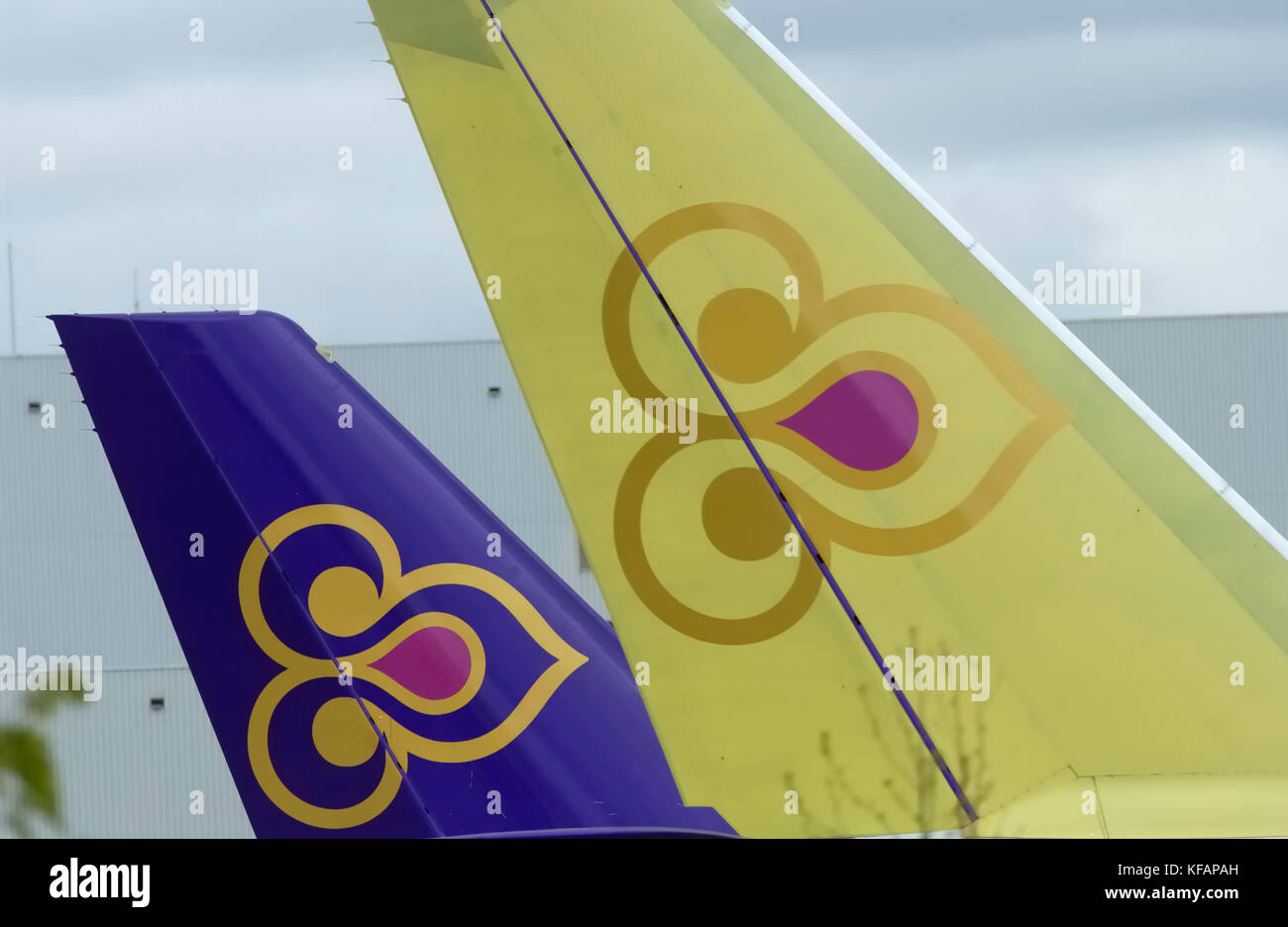 Tails Of Two Thai Airways International A340 642 Aircraft One In Yellow Primer Livery Before Painting Stock Photo Alamy